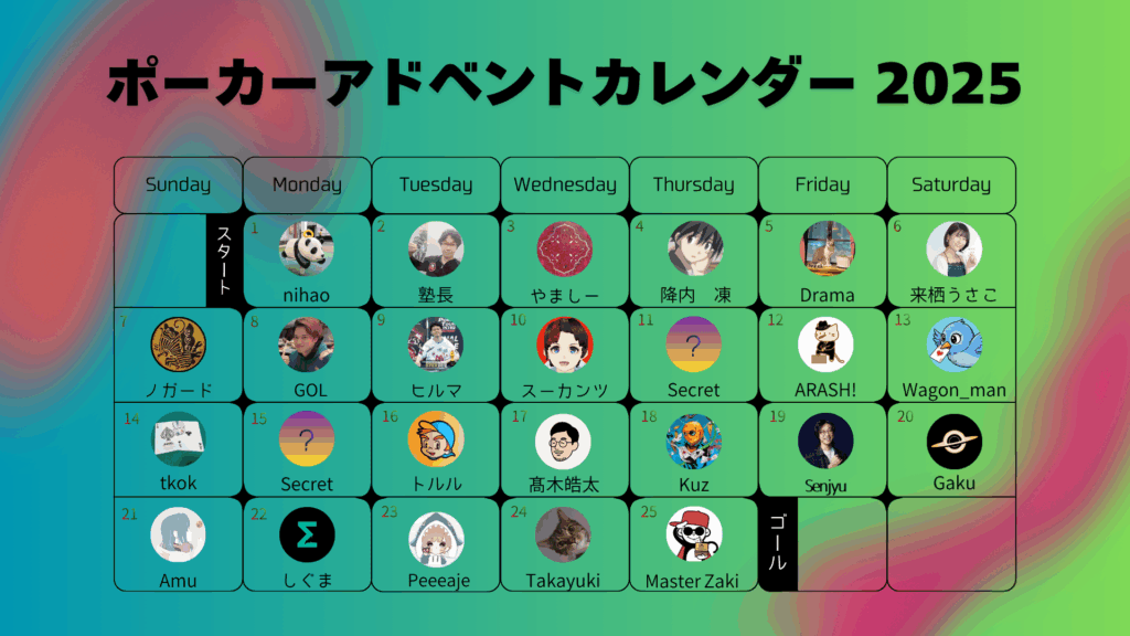 日頃から日本のポーカーシーンを盛り上げている素敵な方々が、このアドベントカレンダーのために集結! 個性豊かなメンバーが、高度な戦略から激闘の遠征録、ユーモアたっぷりのエッセイまで、多彩なテーマで記事を寄稿してくれます。期間中は1日も見逃せない、ワクワクする毎日になること間違いなしです!