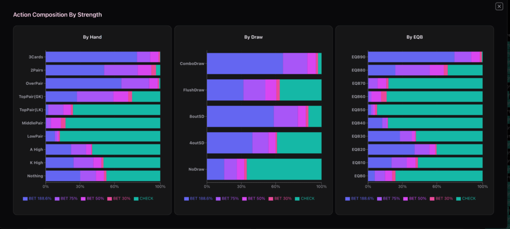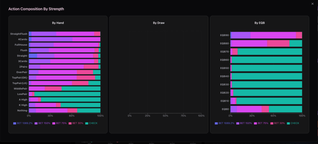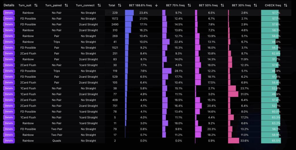 Flopとは違い中程度の強さのハンドのチェック頻度が80%を超えていることが分かります。 基本的にスタックが浅くなければTurn以降のベットレンジはポラライズされます。