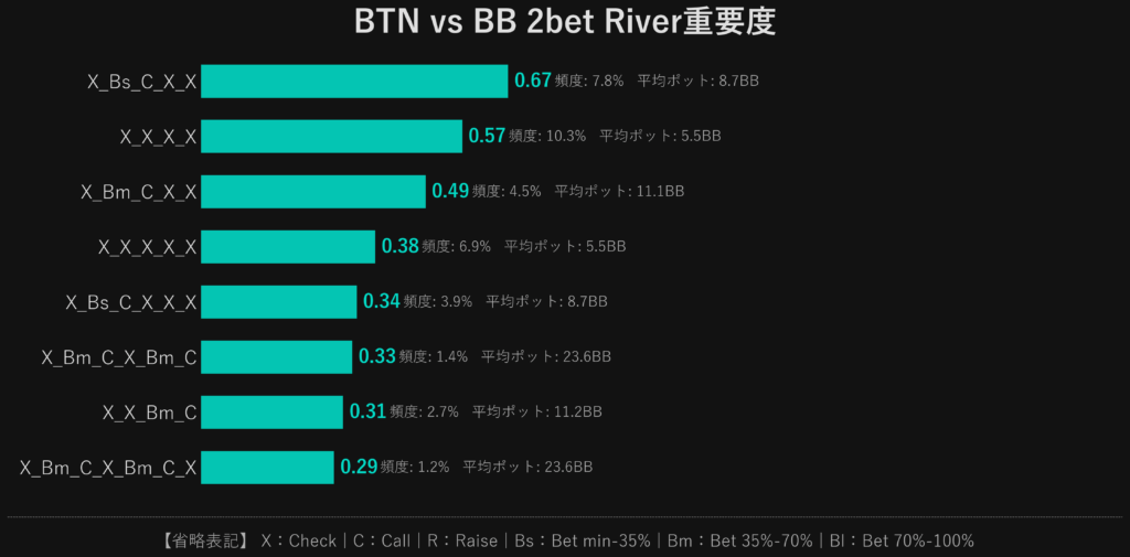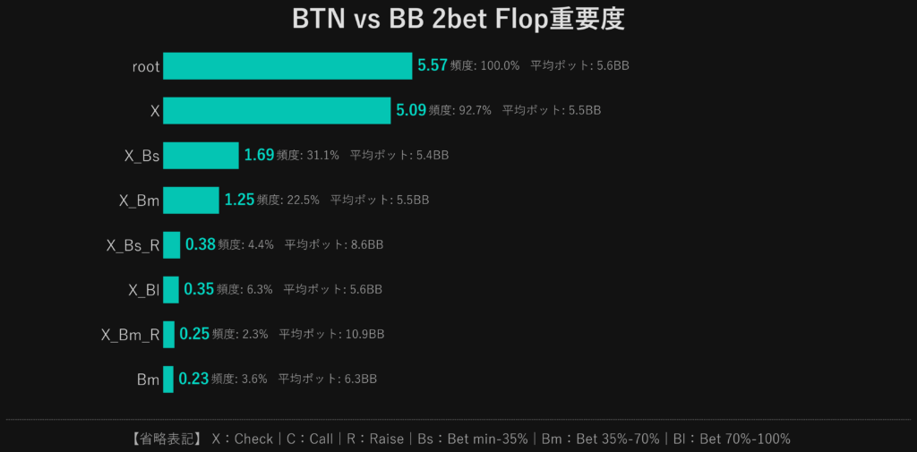 重視すべきPostflopが分かったので、次はノード別の重要度を見ていきます。 最も重要度の高かったBBvsBTN 2betのデータを見ていきます。