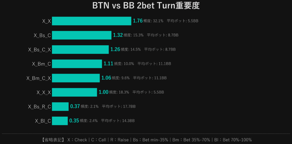 当然ですがBBとBTNが最初にアクションをするノードが他を引き離しています。 ドンクベットの頻度が低いことを考えるとFlop CBの学習が圧倒的に重要度が高いことが分かります。