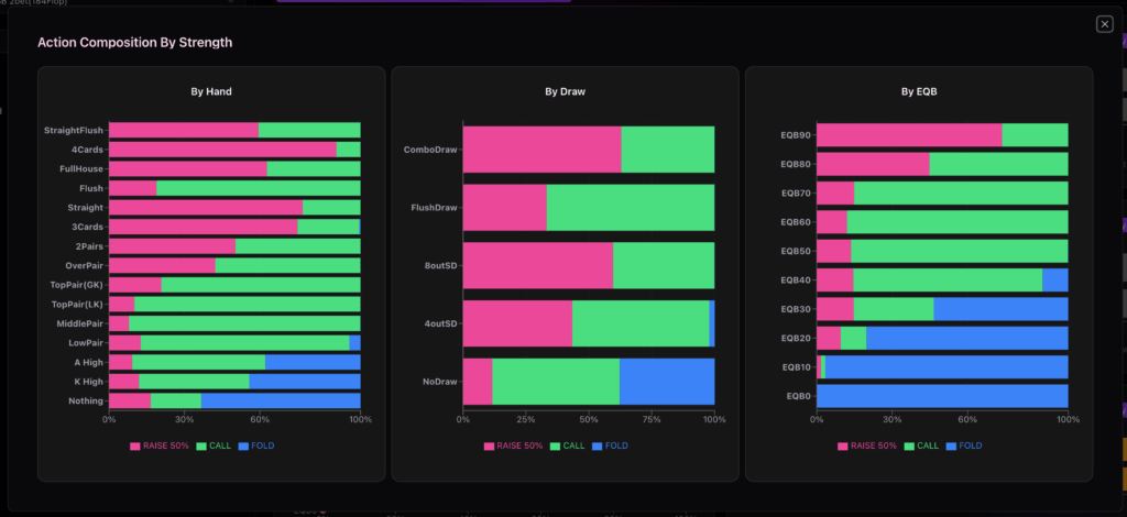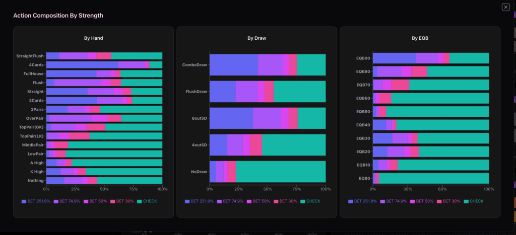 2ペアがバリューの下限となっていて、ブラフレンジのベットアクションは250%が最も頻度が高いことが分かります。 弱いハンドでベットするときは気合いを入れましょう。