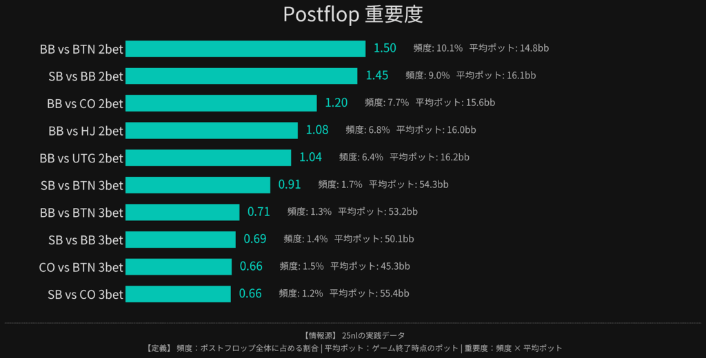 ここからは実際に集計したスポット重要度について解説します。 なお、この章で使用するデータは25NLから収集した約5000万ハンドを母集団としています。