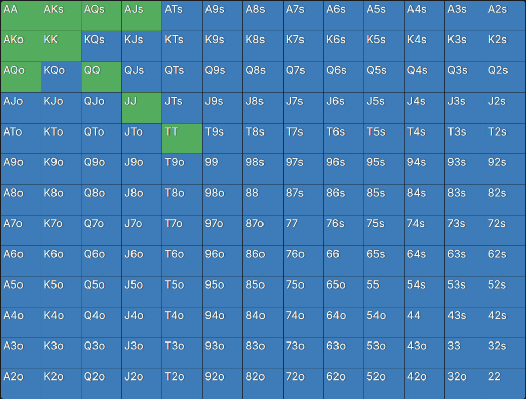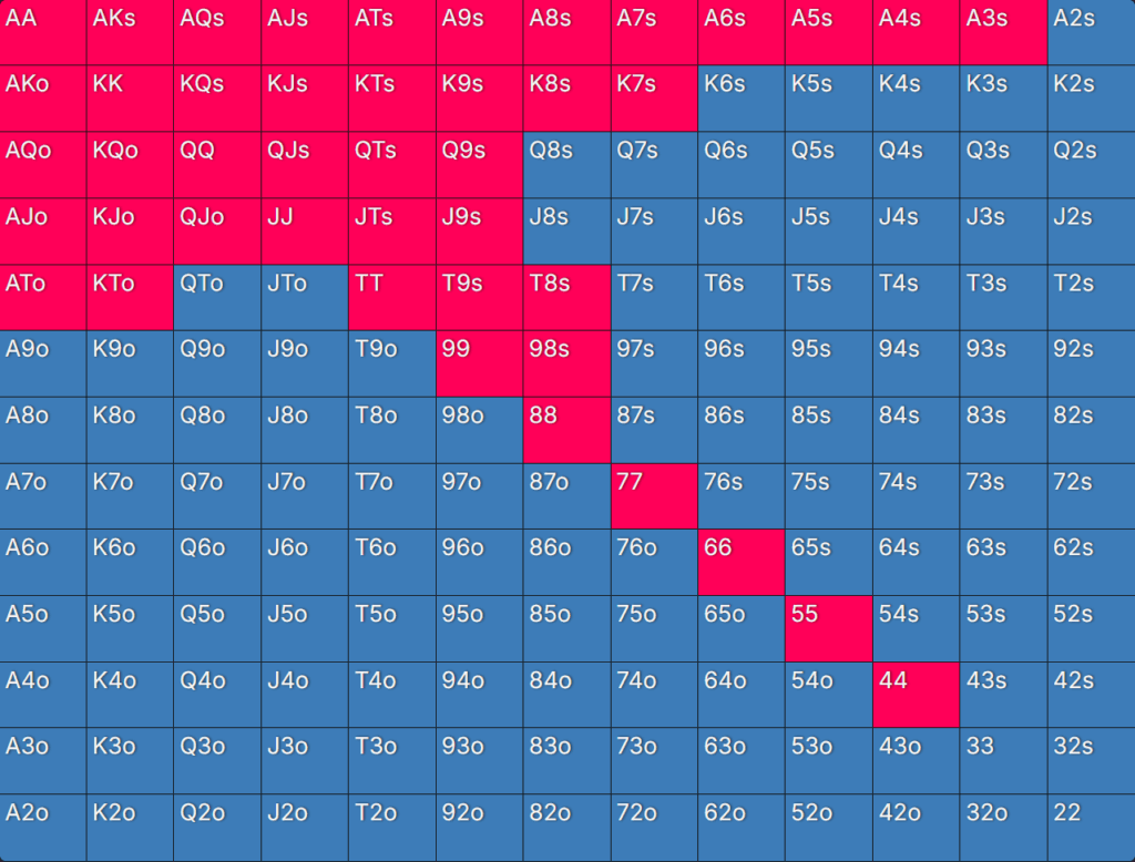 UTG1なのにかなり広いな!ということがわかります。ChipEVではUTG1のopen%=22%なので、約1.5倍。ChipEVのHJ~COのopen%くらいの広さということですね。