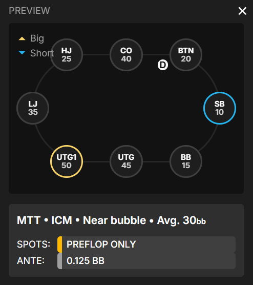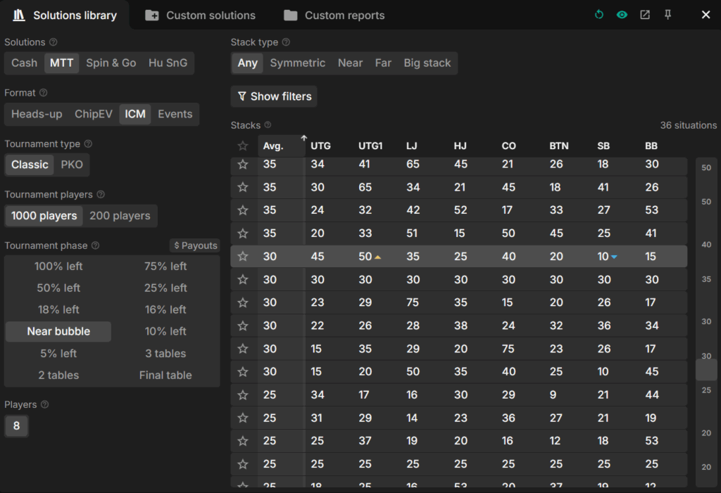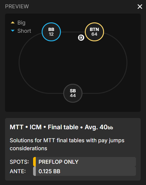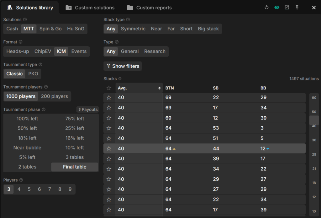 レンジの形とrange%の相互関係が定着したら、今度はGTO WizardのICM Solutionでさまざまなスポットのrange%を確認します。MTTでは同じポジションでもシチュエーションやスタック量の配分次第でPreflopのレンジは大きく様変わりします。それを確認する中で色々感じるものがあるはずです。