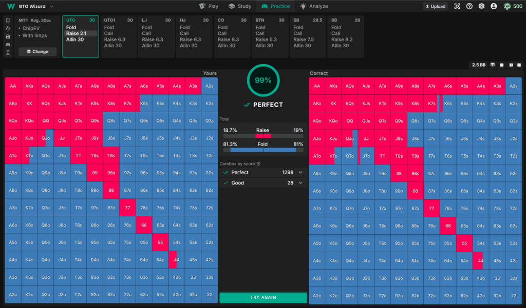 暗記量を減らしたい、ということを前述しましたが、最低限の暗記は必要です。その時に僕がオススメしているのが、GTO WizardのMTT – ChipEV(=トナメ開始直後) – 30bb Effective のopenレンジです。これを基準レンジとして丸暗記しておくと、その後の学習に使いやすいので覚えておいて損はないと思います。