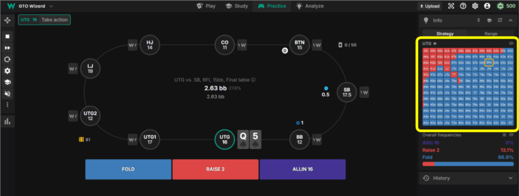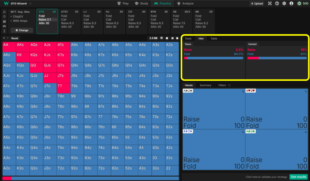 ただし、表示された1ハンドのアクションを正解しても、それはアウトプットとしての質が低すぎます。その瞬間のrange%はどのくらいか、そのレンジの下限はどこにあって、それを踏まえると表示されているハンドのアクションはどうなるか。そこまで回答できて初めてそのスポットを理解している、と言えるでしょう。
