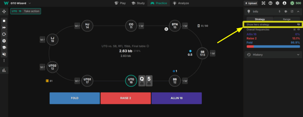 さらにそこからレンジ表の細かい構成を確認するには、[Show hero strategy] の横にある目のアイコン(👁)を押せばレンジ表が表示されます。同じrange%であっても、ポケットやスーコネが極端に削られているケースがあるため、そういった細かい形状まで確認する際にはこの機能が便利です。