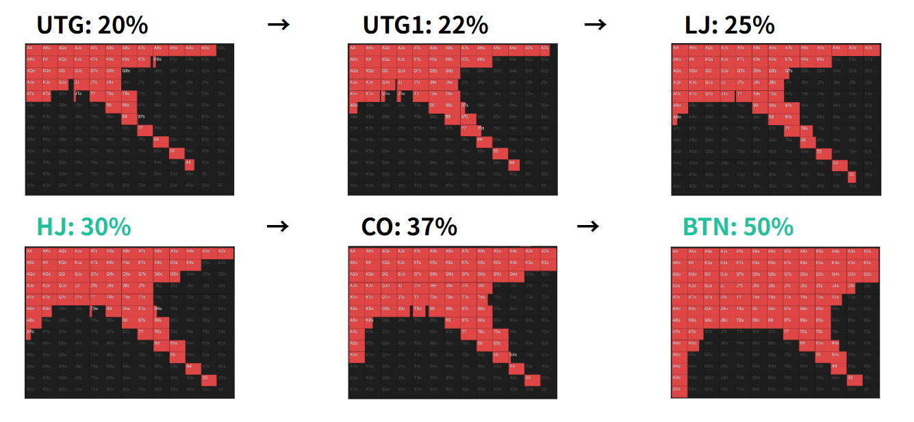 大事なのは、「HJのopenレンジはこのくらい」と考えるのではなく、「下限ハンドがXXならレンジ全体の30%くらいになる」という部分を強烈に意識することです。まずはレンジ構成と30%という数値を紐づけて認識することにフォーカスしてから、HJのopen%=30%という知識を後付けで組み合わせるイメージです。