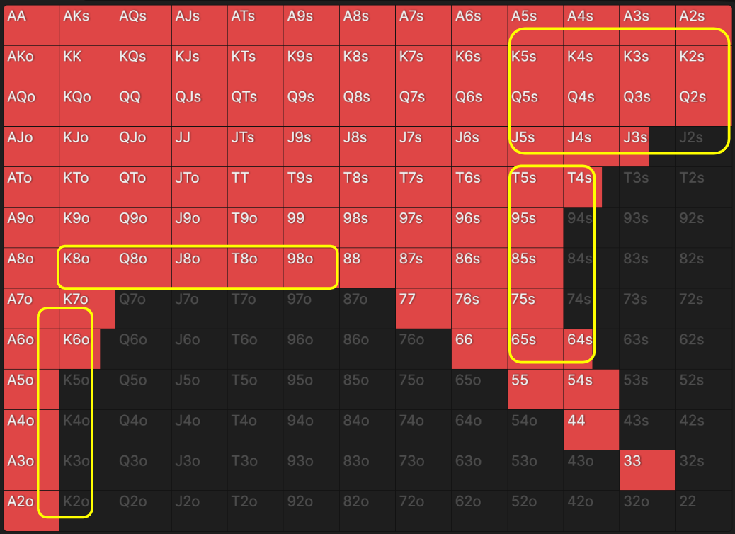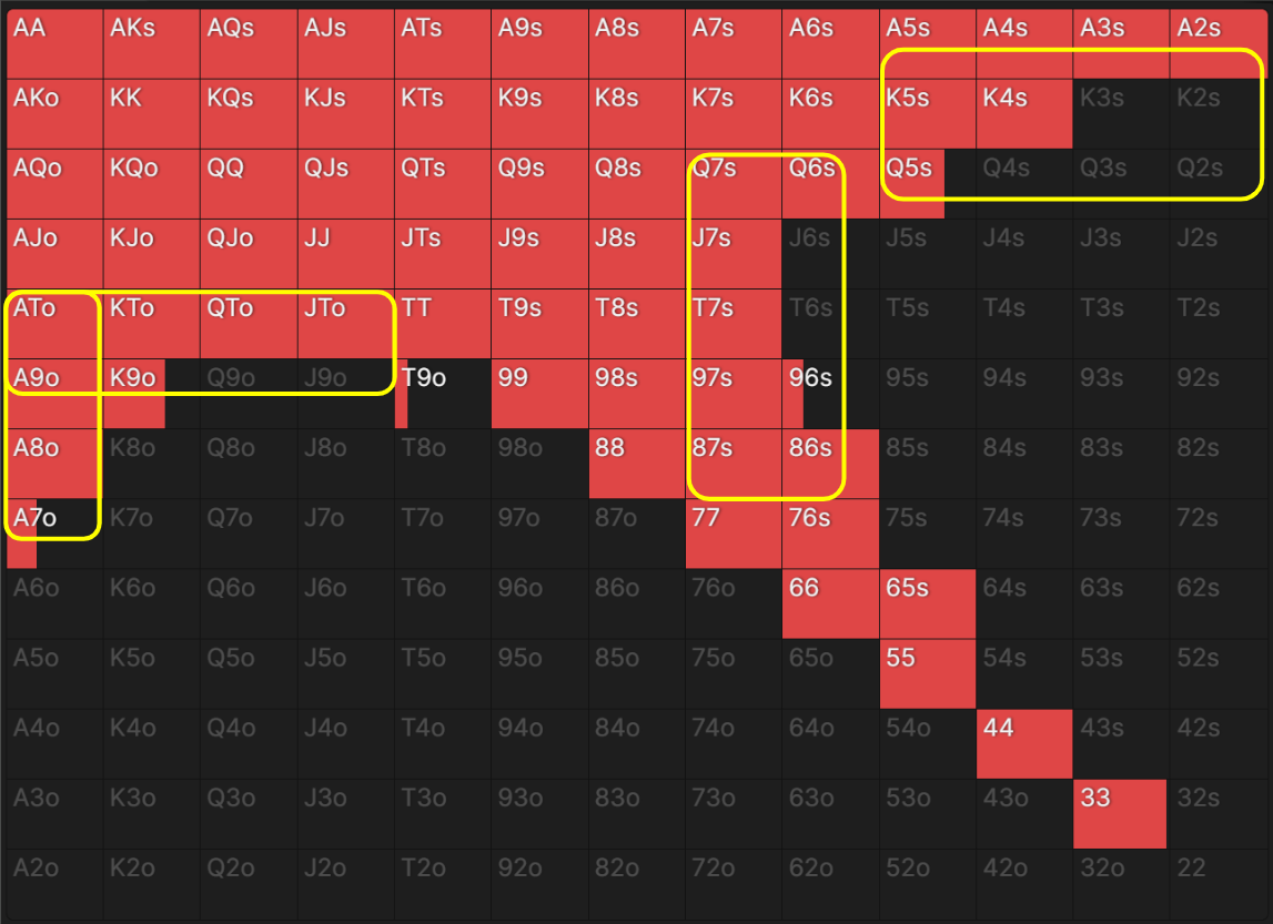 レンジ表と30%という数値を紐づけるカギになるのは、「下限ハンド」です。レンジ表から読み取れる下限ハンド群をざっくり分類してみましょう。