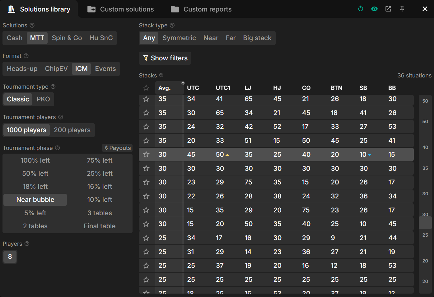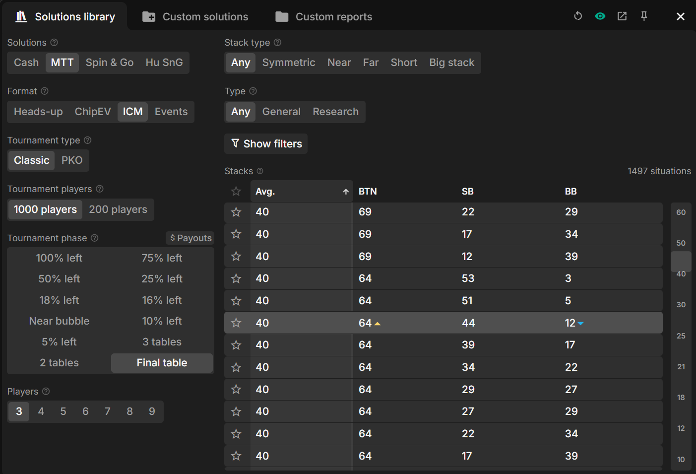 レンジの形とrange%の相互関係が定着したら、今度はGTO WizardのICM Solutionでさまざまなスポットのrange%を確認します。MTTでは同じポジションでもシチュエーションやスタック量の配分次第でPreflopのレンジは大きく様変わりします。それを確認する中で色々感じるものがあるはずです。