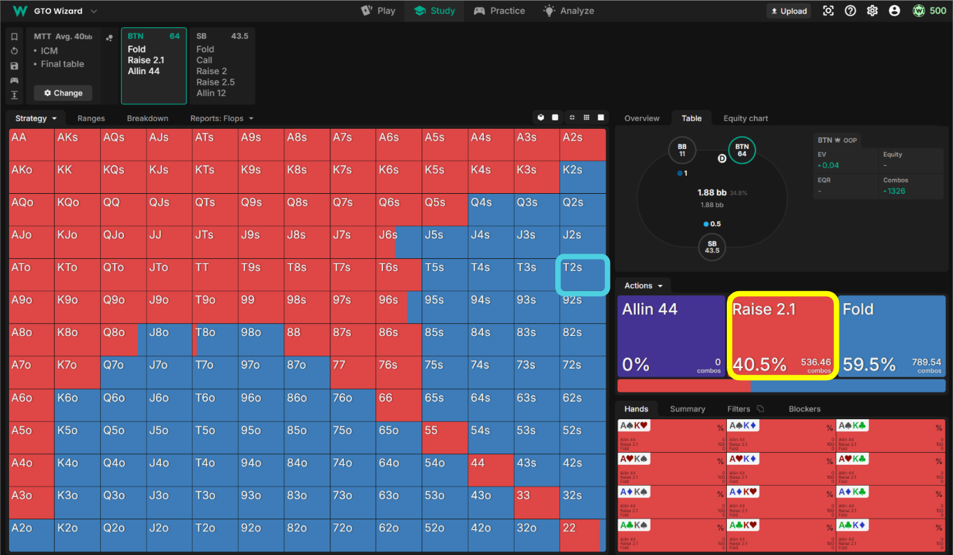 MTTの座学で最も重要なのはPreflopレンジです。MTTはCash Gameよりもプレーする際のEffective Stackが浅く、Preflopでall-inという選択肢が追加されることで戦略の分岐が増え、それぞれの分岐に対するハンドの割り振りなどの複雑性が増すことが一つの要因です。
