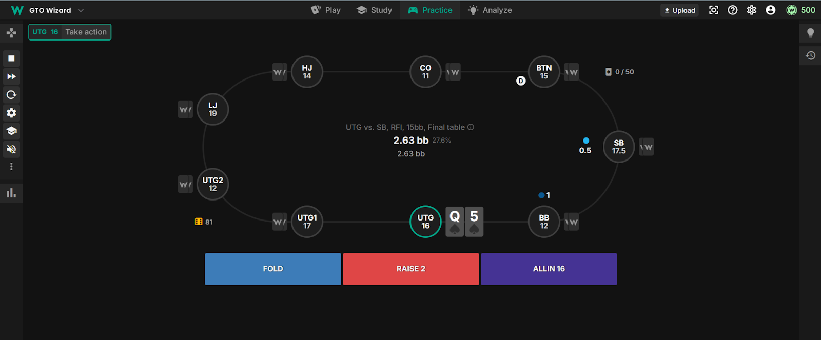 あなたのスタックは45bbで2番目。残りの2人は65bbと15bb。まさに先ほどWizardで見た状況にかなり近いスタック分布です。しかし65bb持ちのチップリーダーはポーカーが上手そうで、着実にチップを増やしていました。