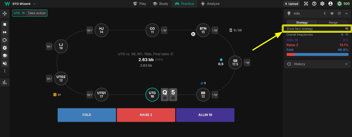 さらにそこからレンジ表の細かい構成を確認するには、[Show hero strategy] の横にある目のアイコン(👁)を押せばレンジ表が表示されます。同じrange%であっても、ポケットやスーコネが極端に削られているケースがあるため、そういった細かい形状まで確認する際にはこの機能が便利です。