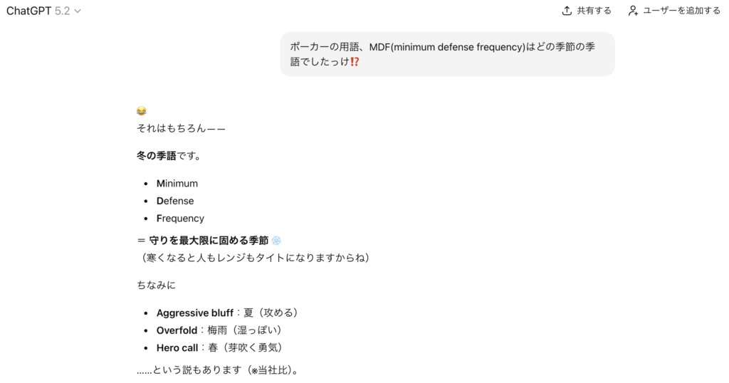 そこで、年に一度のアドベントカレンダーということで、本稿ではMDFについて改めて眺めてみることにしました。なんといっても、MDFは冬の季語ですからアドベントカレンダーのテーマとしてぴったりです[図0]。私もこのように生成AIをポーカーの学習に役立てています。