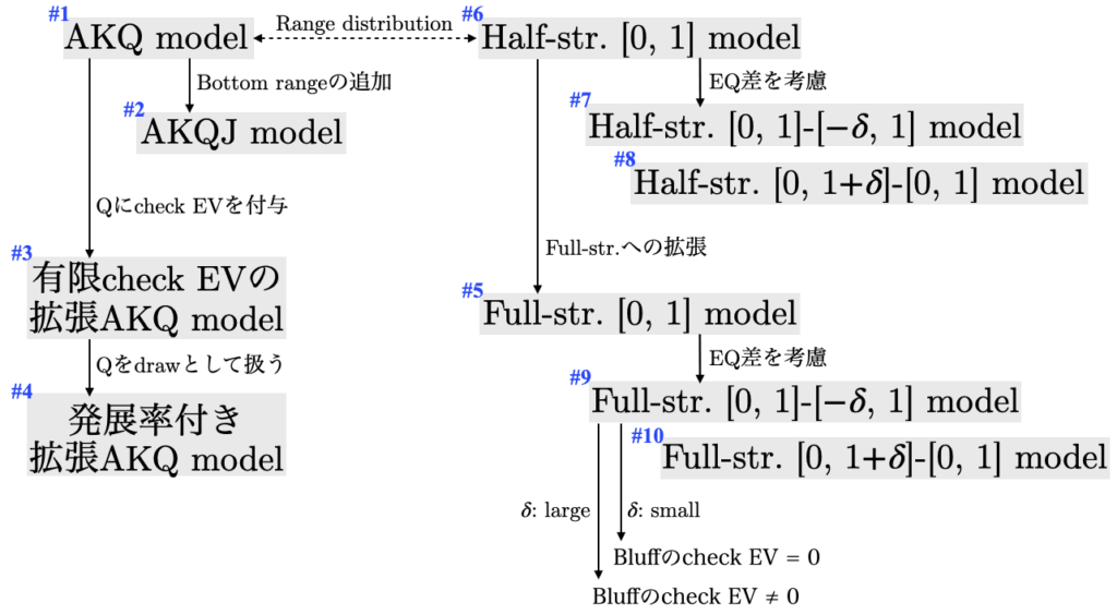 次に2点目のbluff handに有限のEQがあるケースを考えてみましょう。簡単なmodelとして、次のような有限check EVの拡張AKQ modelを考えてみましょう。