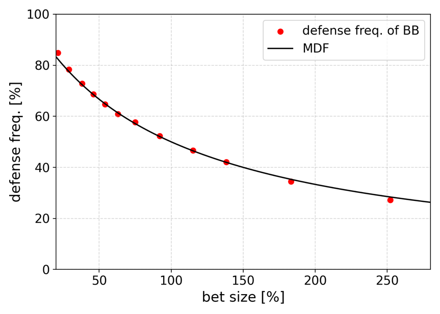 このAKQ modelのNash均衡で導かれた、プレイヤー2の持つKのcall頻度のことをMDF (Minimum Defense Frequency)と呼ぶことにします。つまり、MDFをpot額に対するbet額\( B \)の関数として、