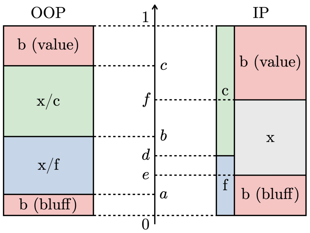 OOP bettorの場合には、EQ差を考慮したfull-street [0, 1] modelが対応し、IPのcall頻度は(基本的に)MDFに一致します(式(1))。