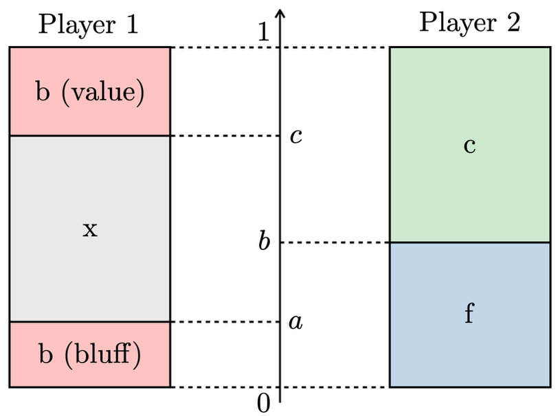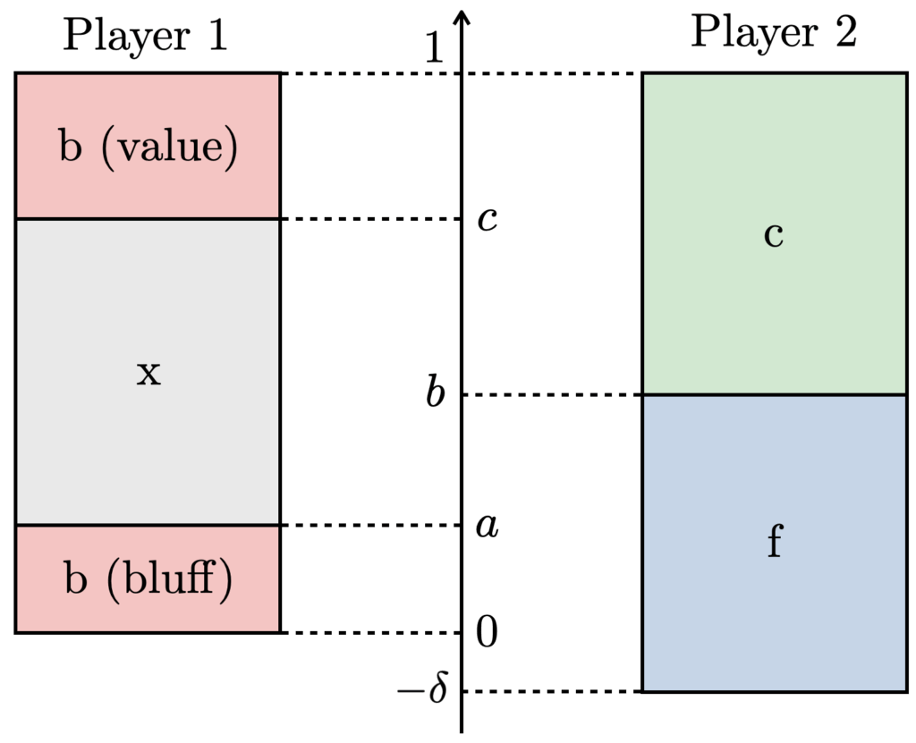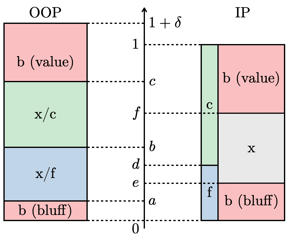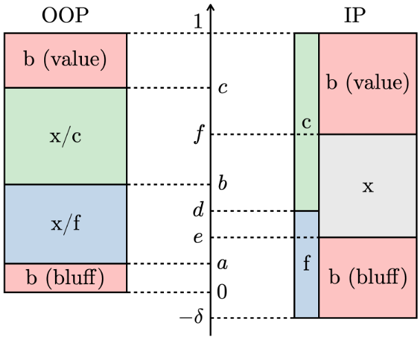 ・OOP(プレイヤー1)の戦略は、\( a, b, c \)の3つの境界で区切られた4つの純粋戦略区間を持つ。\( [c, 1+\delta] \)の区間はvalue bet、\( [b, c] \)の区間はcheck/call、\( [a, b] \)の区間はcheck/fold、\( [0, a] \)の区間はbluff betを行う。