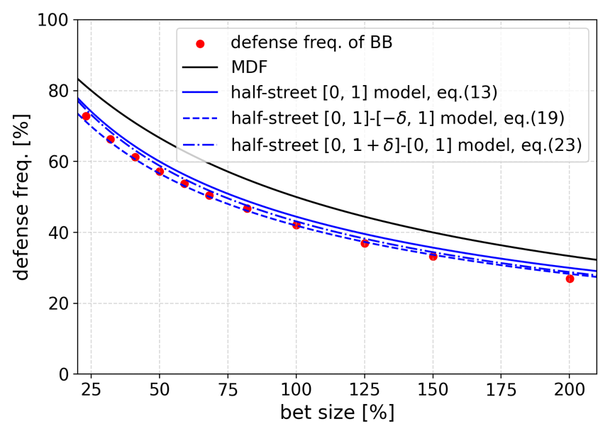 → 今回取り扱ったhalf-street [0, 1] modelについて詳しく計算過程を示した上で、pot betに対してMDFが達成されず50%以上をfoldするのはなぜかという内容を説明しています。