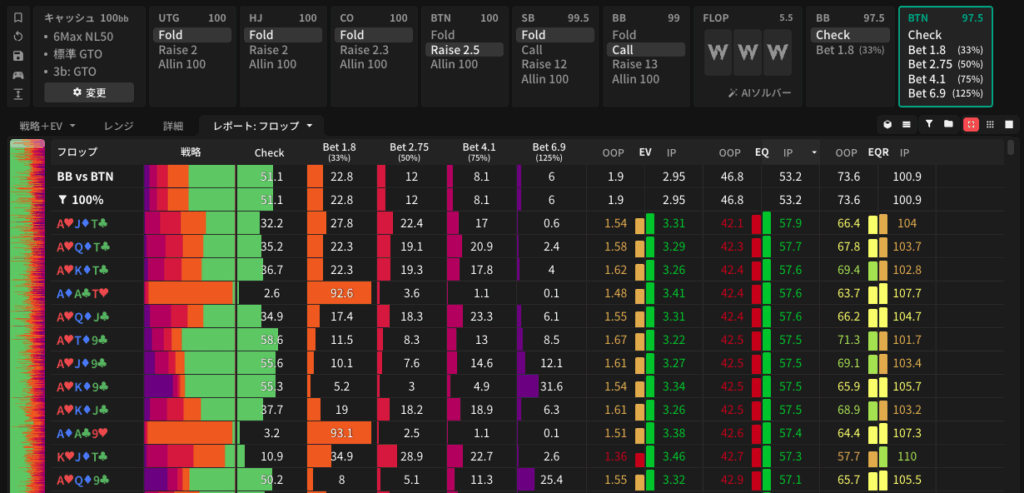 今回、EQ差を考慮するとどのようにcall頻度が変化するかという議論を主に行ったので、それが顕著な例を見てみましょう。図15はBTN vs. BB SRPにおいてBTNのrange EQが高い順番にflopをソートしたものです(solutionはGTO Wizardのcash 100bb, 6max NL50, GTO-GTO)。AJTrのflopでBTNのrange EQ 57.9%となり、最高EQ差を生み出すようです。こちらを取り上げて調べてみましょう。